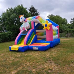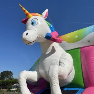 Stap binnen in een wereld vol magische regenbogen , sprankelende sterren en vriendelijke eenhoorns! Laat je dromen uitkomen terwijl je springt en speelt in ons fantastische unicorn springkasteel. Hier is alles mogelijk – vliegen over regenbogen, galopperen met eenhoorns en zoveel plezier maken als je kunt!