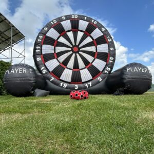 Beleef de ultieme combinatie van voetbal en darts met voetbaldarts – dé hit op feesten, sportdagen, vrijgezellenfeesten en familiedagen! Trap de bal tegen een gigantisch opblaasbaar dartbord en scoor punten als een pro. Wie raakt de bullseye?